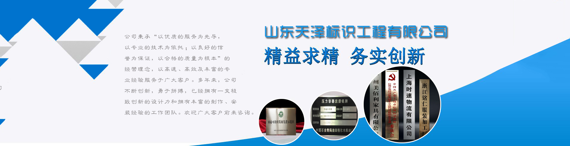 山東天澤標(biāo)識(shí)工程有限公司是一家集創(chuàng)意設(shè)計(jì),生產(chǎn)制造,安裝服務(wù),售后保障為一體的多元化公司。我們擁有先進(jìn)的設(shè)備,專業(yè)的人才,專業(yè)從事蝕刻,仿古,做舊,絲印,烤漆等工藝加工。主要生產(chǎn)機(jī)器銘牌、科室牌、樓棟牌、門(mén)牌、不銹鋼牌、銅牌、鋁牌、鈦金牌、砂金牌、授權(quán)牌、道路標(biāo)識(shí)牌及各類金屬板材的裝飾花紋,同行可代工。 我們一直秉承“以質(zhì)量、效率、服務(wù)博得客戶的滿意,以誠(chéng)信、合作雙贏求得發(fā)展”作為核心價(jià)值,立足創(chuàng)新產(chǎn)品質(zhì)量,誠(chéng)信服務(wù),真誠(chéng)合作,共同發(fā)展,是我們始終如一的追求。為客戶提供優(yōu)質(zhì)的產(chǎn)品是我們永恒的方針。我們將不斷超越自我,一如既往地為客戶創(chuàng)造價(jià)值,提供更優(yōu)質(zhì)的產(chǎn)品和服務(wù)!